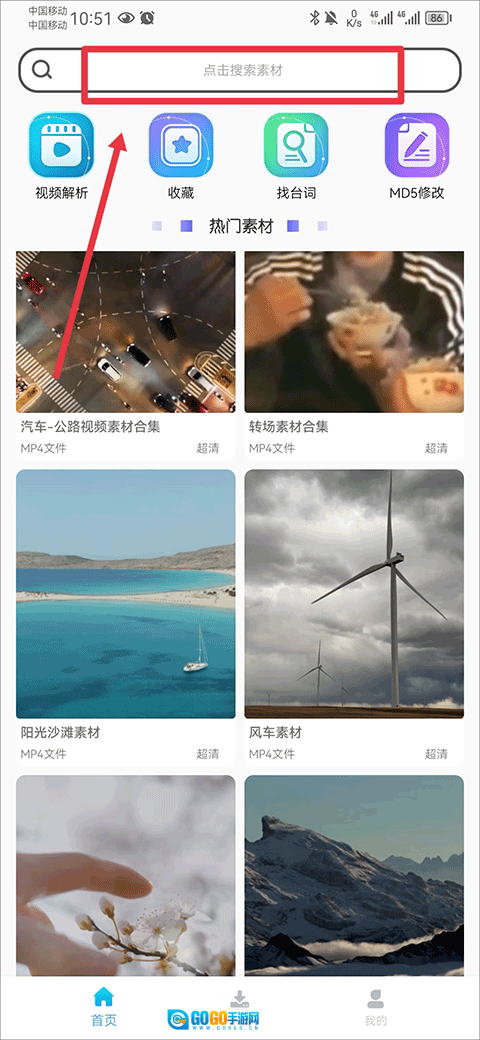 首先在首页上方的搜索框中输入你要查找的素材关键词