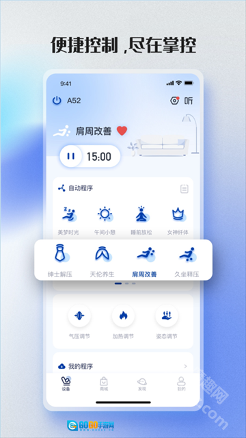 荣泰智能是荣泰为旗下智能设备打造的控制软件,主要用于连接按摩椅、按摩器等设备。用户在手机上安装该软件后,添加对应的按摩设备,就能直接对荣泰按摩椅进行操控,比如切换颈肩舒缓、肩周改善、久坐释压等自动程序,操作十分便捷。
