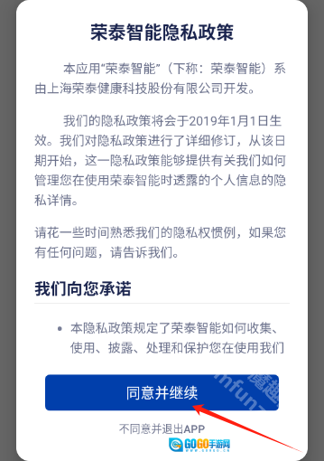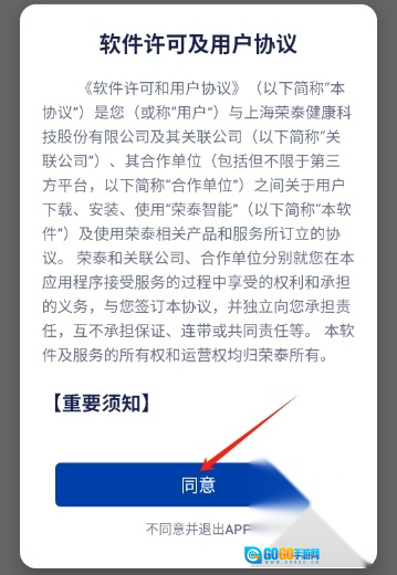 安装并打开荣泰智能,点击同意并继续