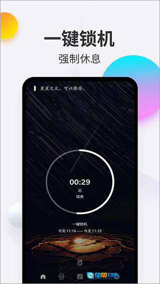 一键锁屏功能能够让人迅速切换到专注模式,有效避开手机带来的各种干扰,从而帮助大家不再沉迷手机,远离低头族的生活状态。