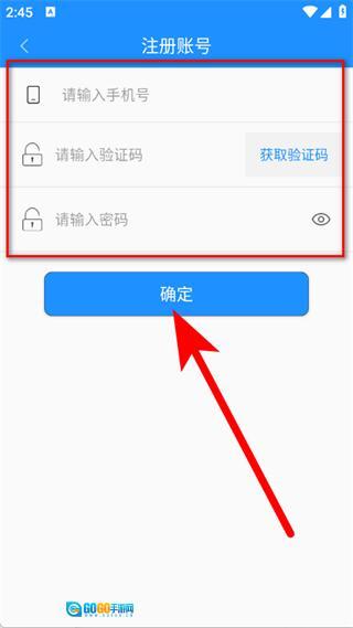 输入手机号码、验证码和密码后,点击确认按钮,即可完成账号注册。