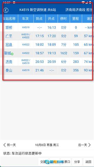 查看该车次的站点、到点、开点等详细时刻表信息。