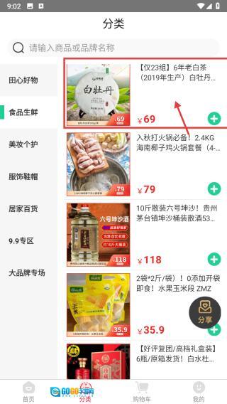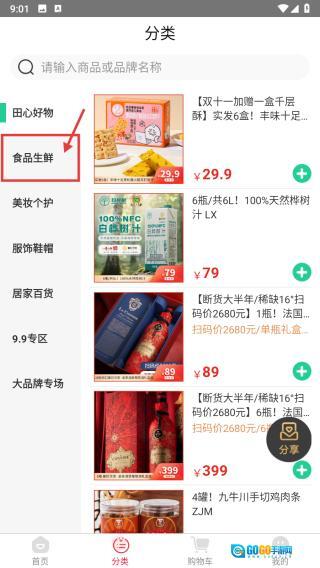 在分类页面,选择食品生鲜板块,即可进入食品生鲜商品的列表页面。