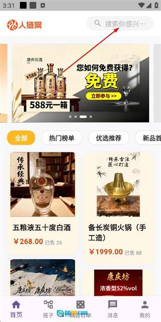 在人链网首页点击顶部的搜索框,即可进入商品搜索输入页面。
