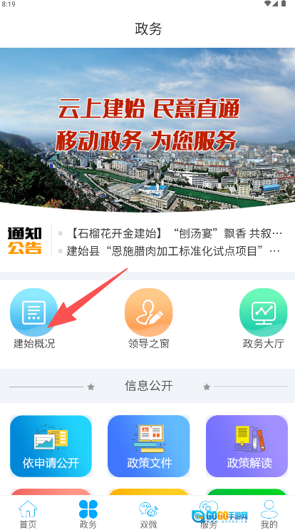 政务板块与政府直接相连,借助建始概况等功能图标,能够迅速跳转到县情数据页面。