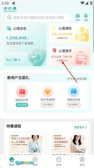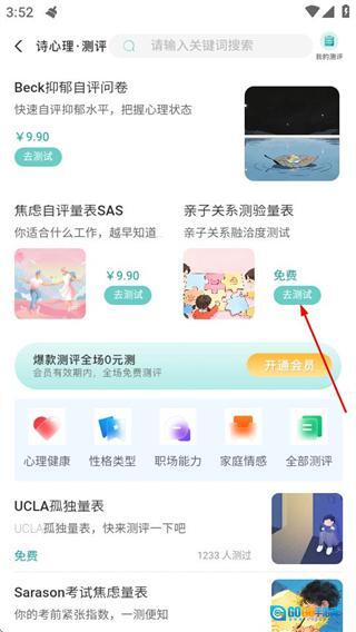 进入诗心理后,点击心理测评板块的“立即前往”按钮,就能进入测评列表页面。