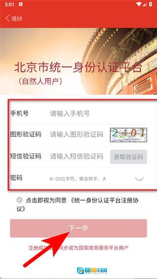 4、请按顺序填写手机号、短信验证码和密码,随后点击“下一步”按钮,即可完成注册流程。