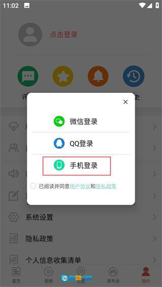 3、在登录方式选择框中,选择手机登录选项,即可进入手机登录页面。