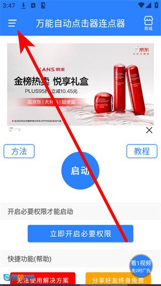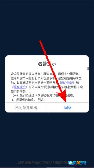 打开万能自动点击器连点器应用,在弹出的窗口里点击同意按钮,随后进入主界面。