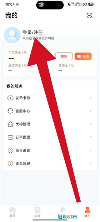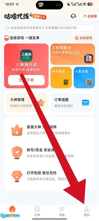 打开咕噜代练应用后,找到底部导航栏中的“我的”选项并点击,即可进入个人中心页面。