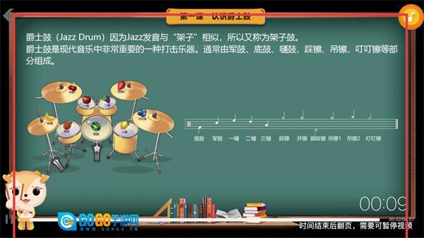 4、在课件学习页面,用户能够观看爵士鼓相关知识的教学视频。