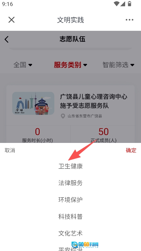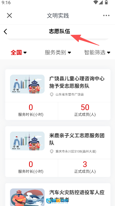 筛选维度清晰明了,支持按全国范围、服务类别等条件筛选志愿队伍,能够精准找到适配的队伍,使志愿参与更有针对性。