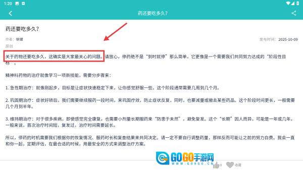 在文章列表里,找到《药还要吃多久?》这一条目,点击它就能进入文章详情页面啦。