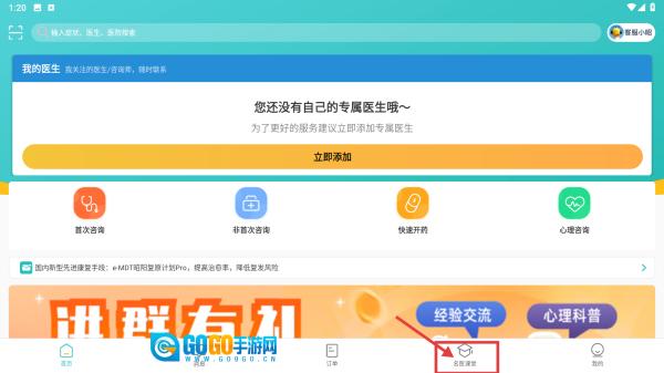 打开医疗健康类应用,点击底部的“名医课堂”选项,即可进入名医课堂页面。