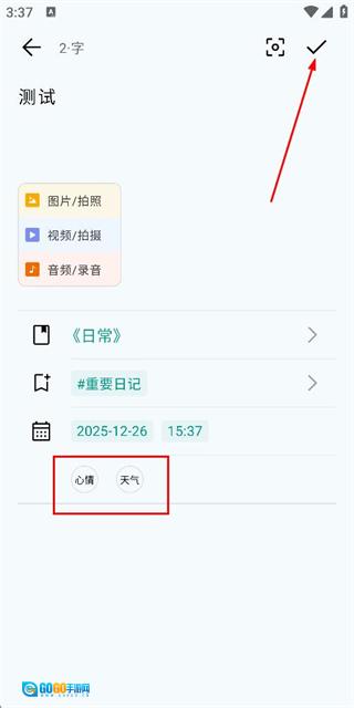 完成内容编辑后,点击右上角的确认按钮来保存这条日记。