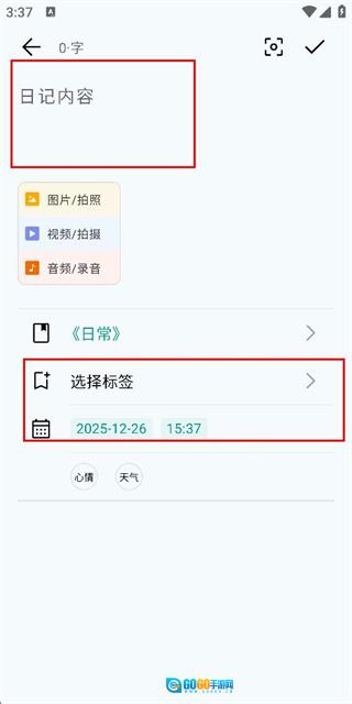 在编辑页面填写日记内容,选择标签及日期等信息。
