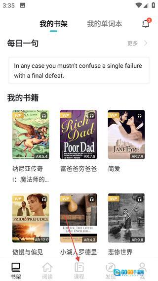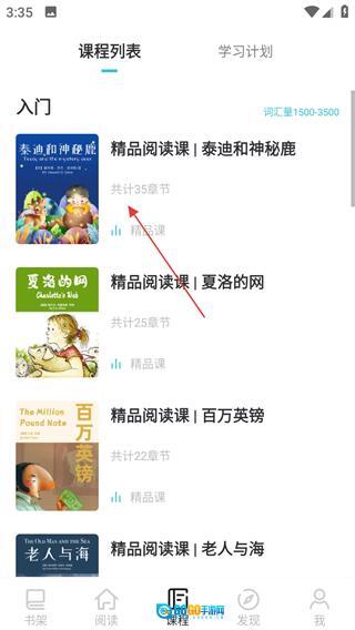 进入英语读书后,点击底部的课程选项,即可进入课程列表页面。