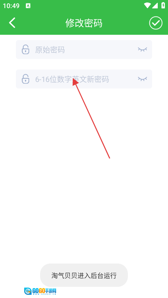 在密码修改页面,先输入原密码与新密码,接着点击右上角的对勾按钮,就能完成密码的修改操作。