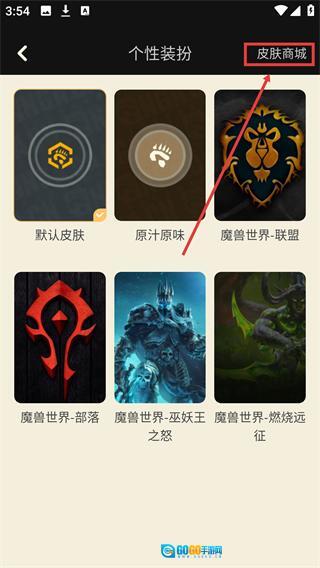 在【个性装扮】页面,点击右上角的【皮肤商城】选项,即可进入皮肤商城的商品浏览界面。