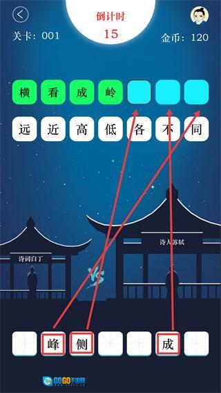 在挑战过程中,把底部的【峰】【側】【成】等文字块拖到上方的空格位置,完成诗句的部分拼接,一步步达成关卡的要求。