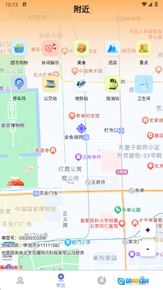 在周边页面中可以查询周边的超市购物、休闲娱乐、美食、酒店、停车场、公交站点、地铁站点以及加油站等相关信息。
