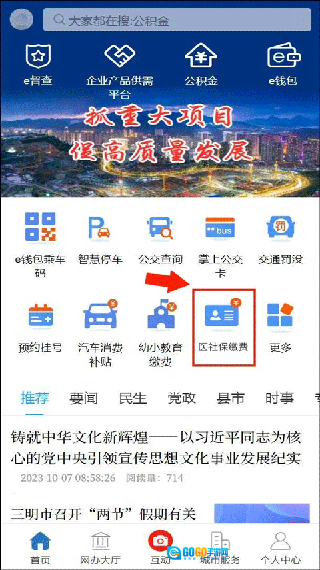 打开e三明应用,在首页找到并点击【医社保缴费】的图标,这样就能进入对应的缴费页面了。