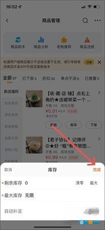 在该商品的库存编辑页面里,找到剩余库存旁边的清零按钮,把剩余库存从无限库存调整为零库存,接着点击“完成”。