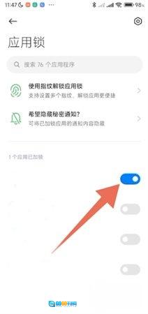 在应用锁界面里,找到“小米应用商店”,点击它旁边的加锁按钮,这样就能完成该应用的加锁配置了。