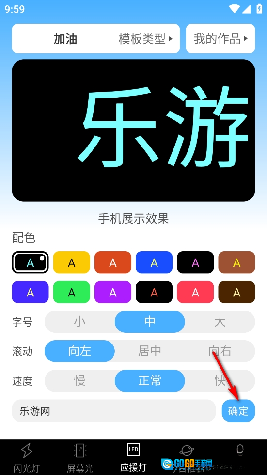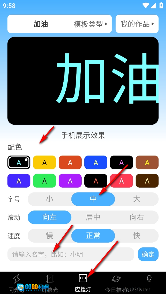 点击【应援灯】,可以选择配色、字体大小、滚动输入等功能。