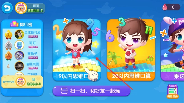 在训练难度选择页面,用户能够依据自身能力挑选【9以内思维口算】【20以内思维口算】等不同级别的难度内容,并且可以通过查看排行榜来知晓其他用户的训练进展情况。