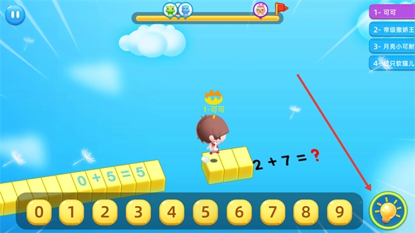 4、在接下来的关卡里,碰到像【2+7=?】这样的新算式时,要快速算出结果并选择对应的数字。要是遇到难题,可以点击【灯泡】按钮来获得提示,帮助你顺利通过关卡。