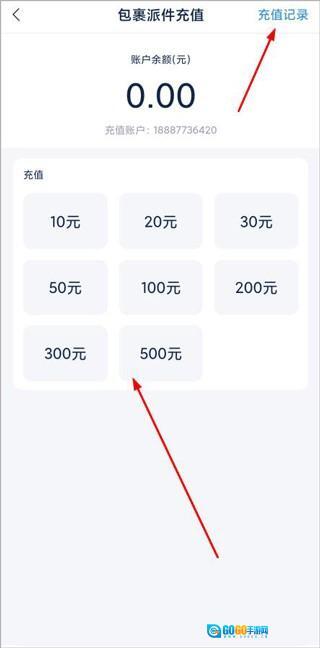 4、充值页面可以为包裹派件充值,还可以查看充值记录;