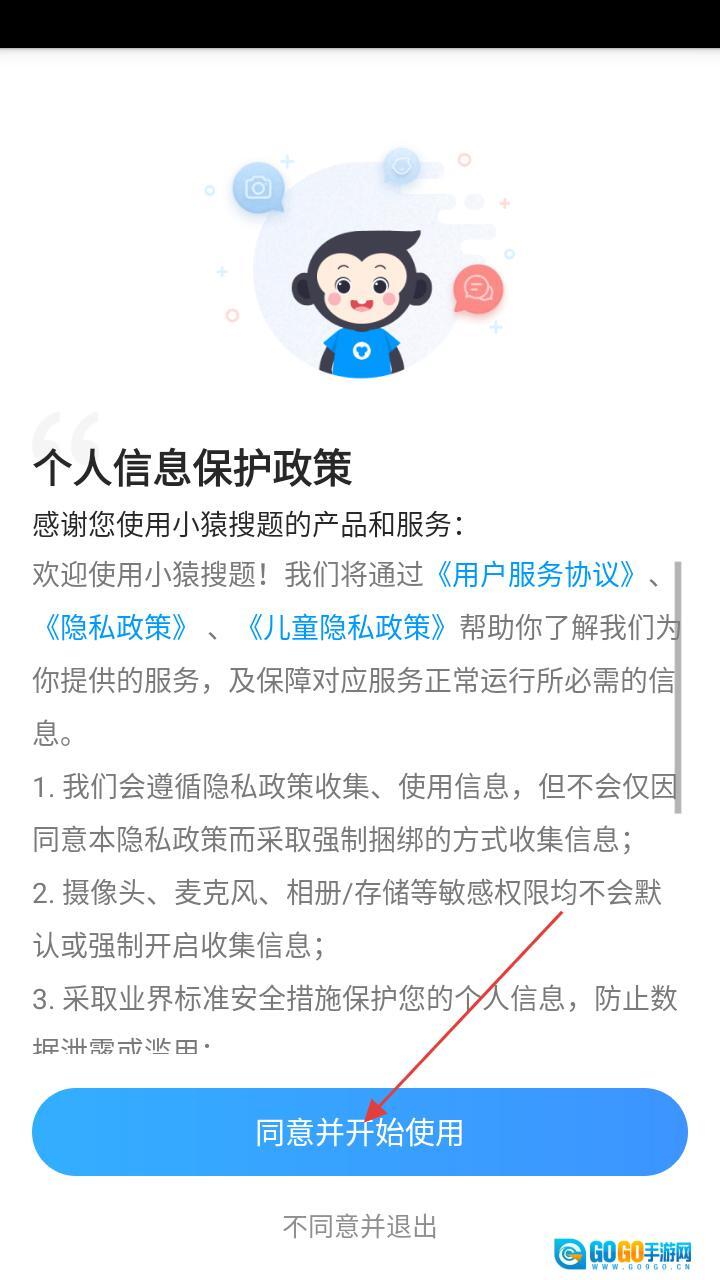 1、在小猿搜题的个人信息保护政策页面,点击【同意并开始使用】按钮,即可进入登录方式选择页面。