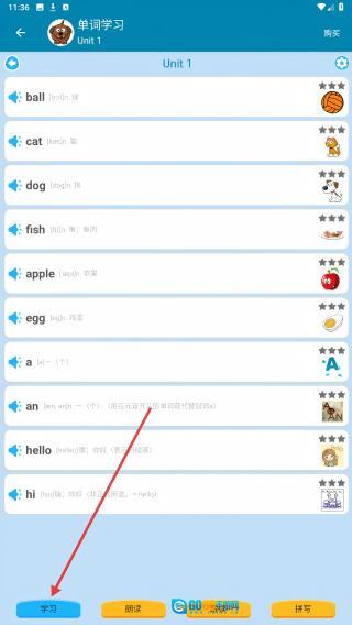 3、进入单元单词列表,点击底部【学习】按钮。