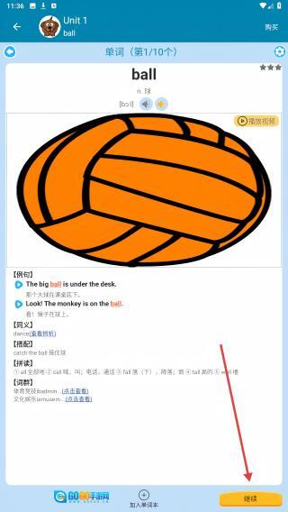 4、完成单词详情的学习后,点击右下角的【继续】按钮来推进后续学习。