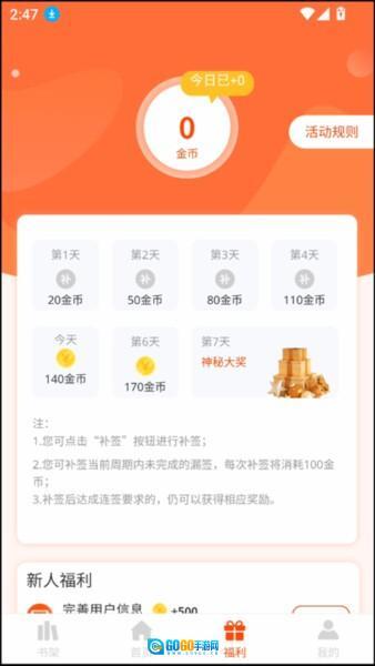 3、在福利界面下,我们可以进行签到操作,能够获得金币奖励。