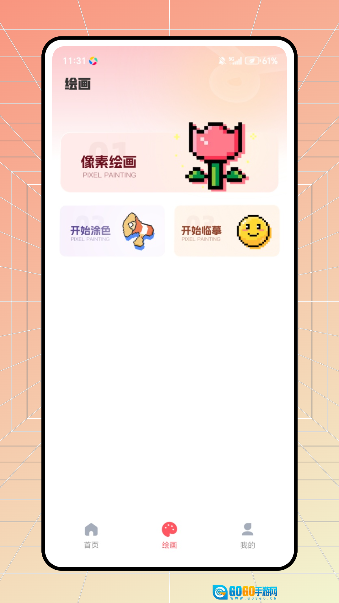 绘画页面包含像素绘画、开始涂色、开始临摹等功能模块。
