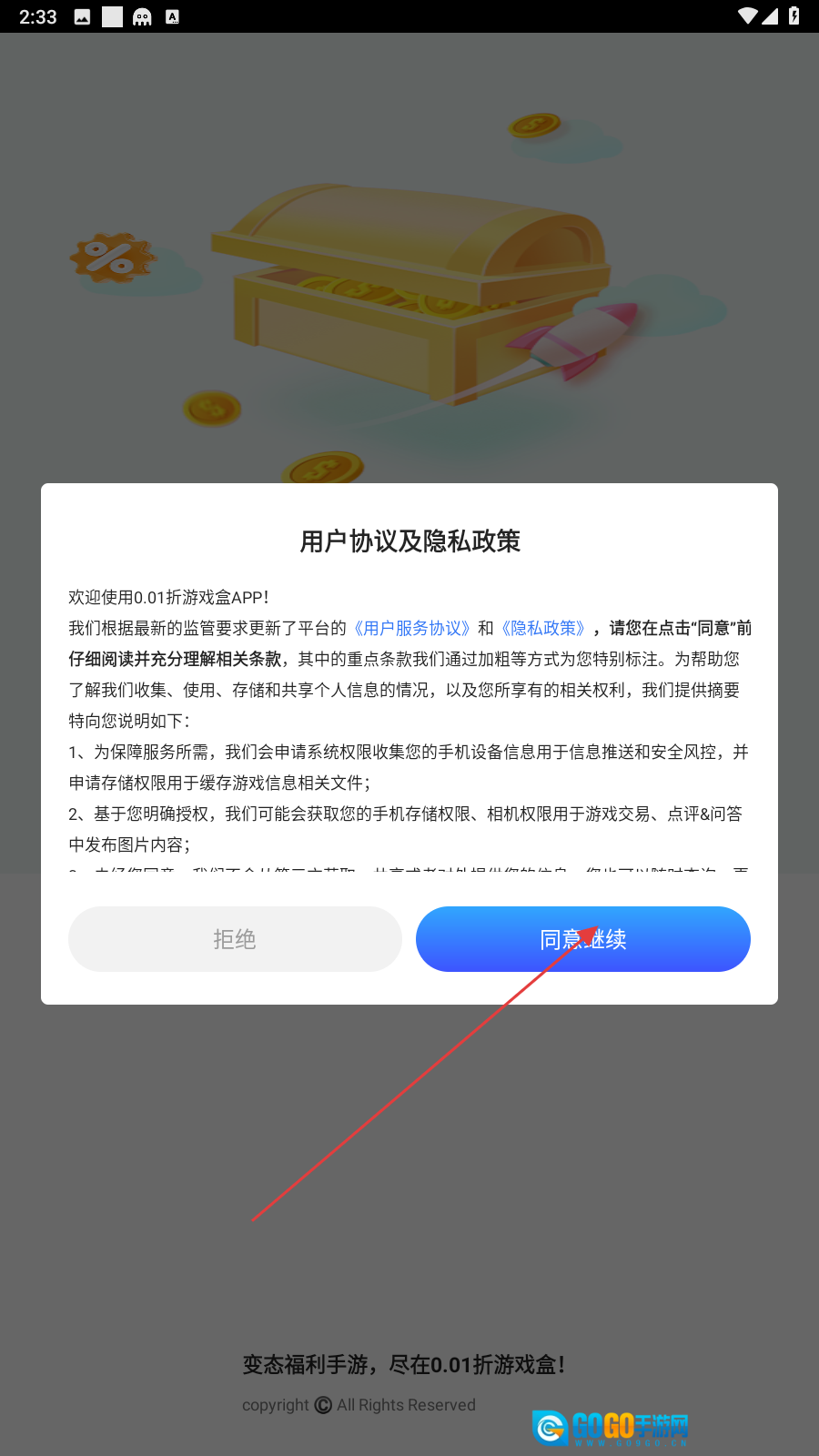 首次打开0.01折游戏盒时,请点击【同意并继续】按钮以接受相关协议。