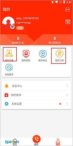 4、点击我的可以看到自己的设备和订单。