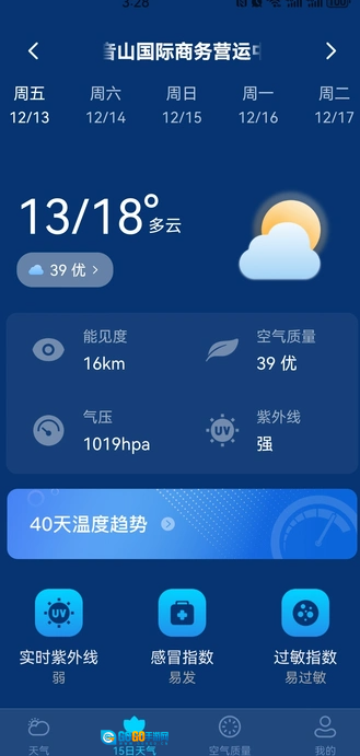 可以查看未来15天的天气预报,其中包含气温变化趋势、降水可能性、穿衣建议以及紫外线强度等信息。