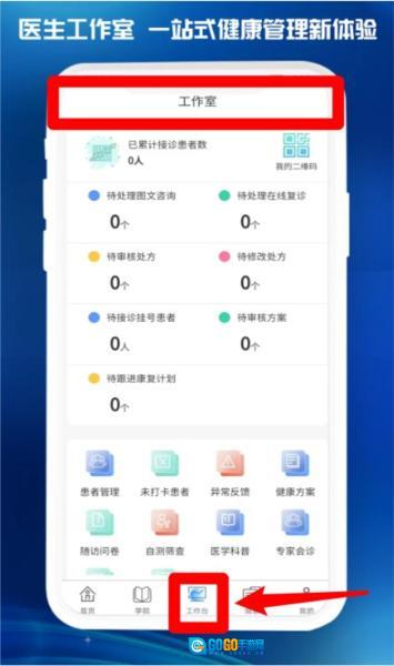 3、“工作台”提供医生专属工作室,具备患者管理、处方处理、健康方案制定等多种实务功能。