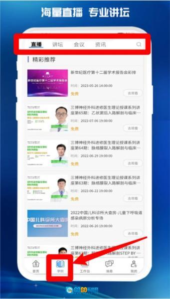 2、进入“学院”板块可浏览直播、讲坛、会议及医学资讯,适合医生进行学术学习与知识更新。