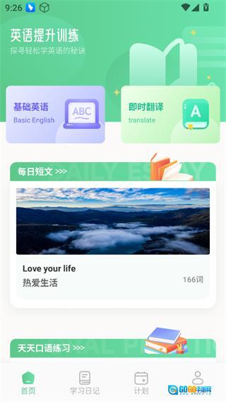 1、首页可以随时进行英语学习,还提供了即时翻译、查看每日短文等一系列功能。