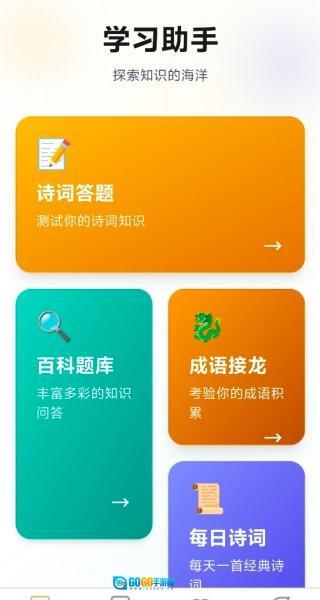 1、进入首页后,即可选择诗词答题、百科题库、成语接龙等不同类型的内容。