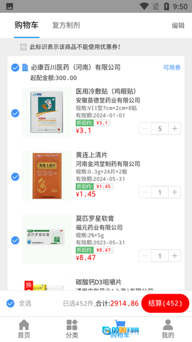 1、通过搜索功能快速查找所需药品,支持多种药品分类。