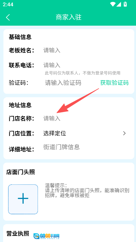 3、填写入驻信息,基础信息、地址、门店照片等。