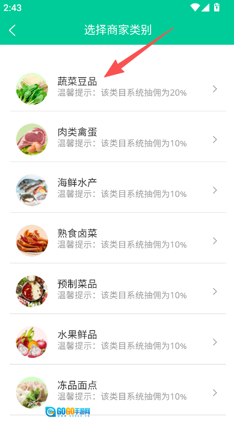 2、选择商家类别,如蔬菜豆品。