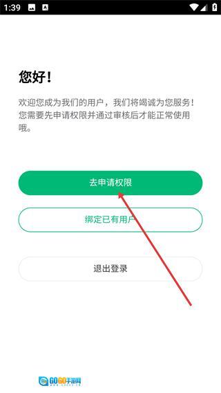 3、完成注册后,页面会跳转到权限申请提示页,点击【去申请权限】按钮,即可进入权限申请流程的信息填写界面。