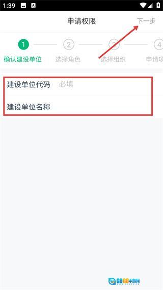 4、在权限申请流程的“确认建设单位”环节,需准确填写必填项“建设单位代码”与“建设单位名称”,完成后点击“下一步”按钮推进权限申请。