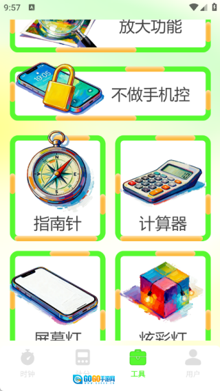 工具页面包含放大、戒手机瘾、指南针、计算器、屏幕灯以及炫彩灯等功能。